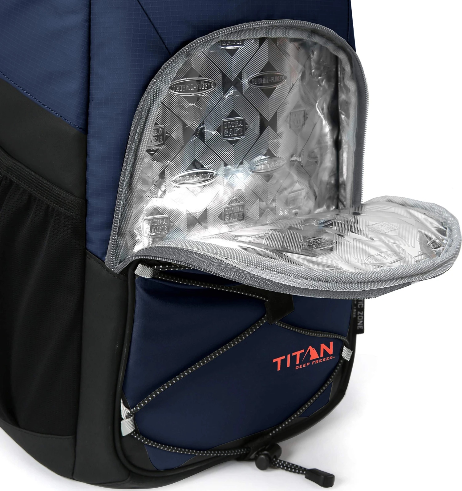 Details: The Titan Deep Freeze 24 Can Backpack Cooler keeps ice up to 2 days! The interior features Deep Freeze high performance insulation with radiant heat barrier, triple layer ColdBlock base, and a leak proof, easy clean lining with Microban antimicrobial protection. The exterior is constructed of durable, stain and water resistant Rhino-Tech and includes an insulated front compartment, 3 pockets, a padded back with breathable mesh panels, and adjustable, padded backpack straps. Interior dimensions: (L x W x H) 10.50″ x 7.50″ x 16.50″