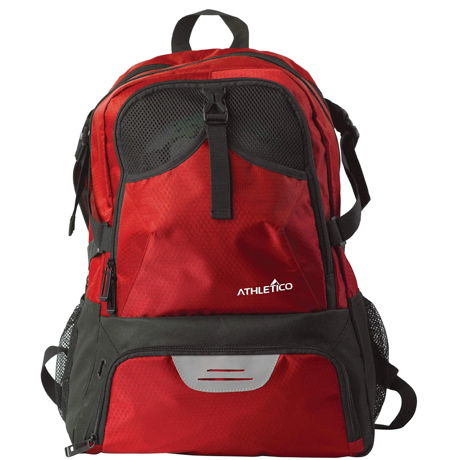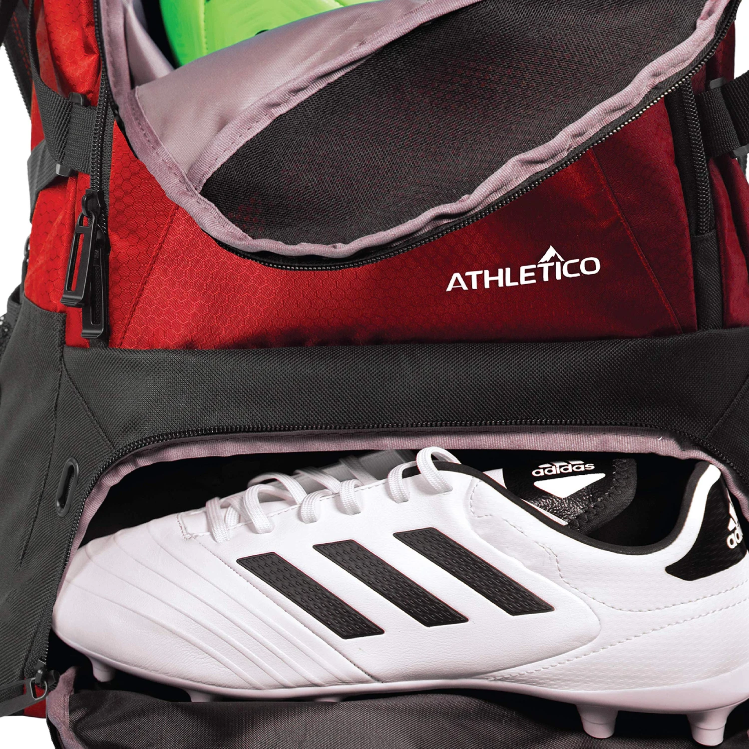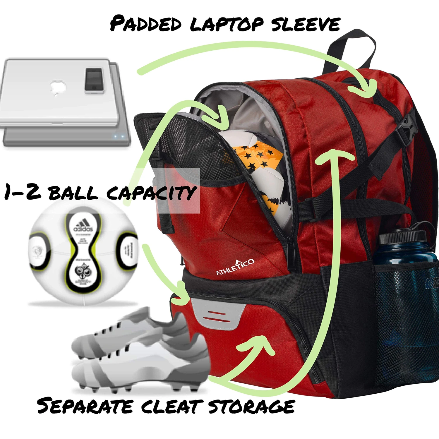 Details: Athletico National Soccer Backpack. The Ultimate Sports Bag. Designed to accommodate players of all ages, this soccer equipment backpack lets soccer players easily carry all of their gear in one bag. Carry up to TWO SOCCER BALLS, with a separate compartment to contain dirty cleats, double water bottle holder, accessories organizer, and padded laptop/tablet sleeve, this backpack has it all. Designed to conveniently carry everything a player needs, on and off the field. Ideal for soccer, school, or work. Backpack size: 19.5 x 14 x 12 in [50 x 36 x 30 cm] Beyond its storage capacity, this soccer ball backpack is designed with padded, adjustable straps for a comfortable, ergonomic fit. Made with durable polyester and nylon fabric, this soccer bag is lightweight, yet rugged enough to withstand rain, mud, and dirt, allowing players to haul their gear in all weather conditions and outdoor environments. The ventilated back and pockets allow for exceptional airflow, keeping players comfortable and preventing odors caused by sweat and dirt. Great for competitive and recreational players alike, this soccer pack is designed to make storage and transportation simple and convenient.