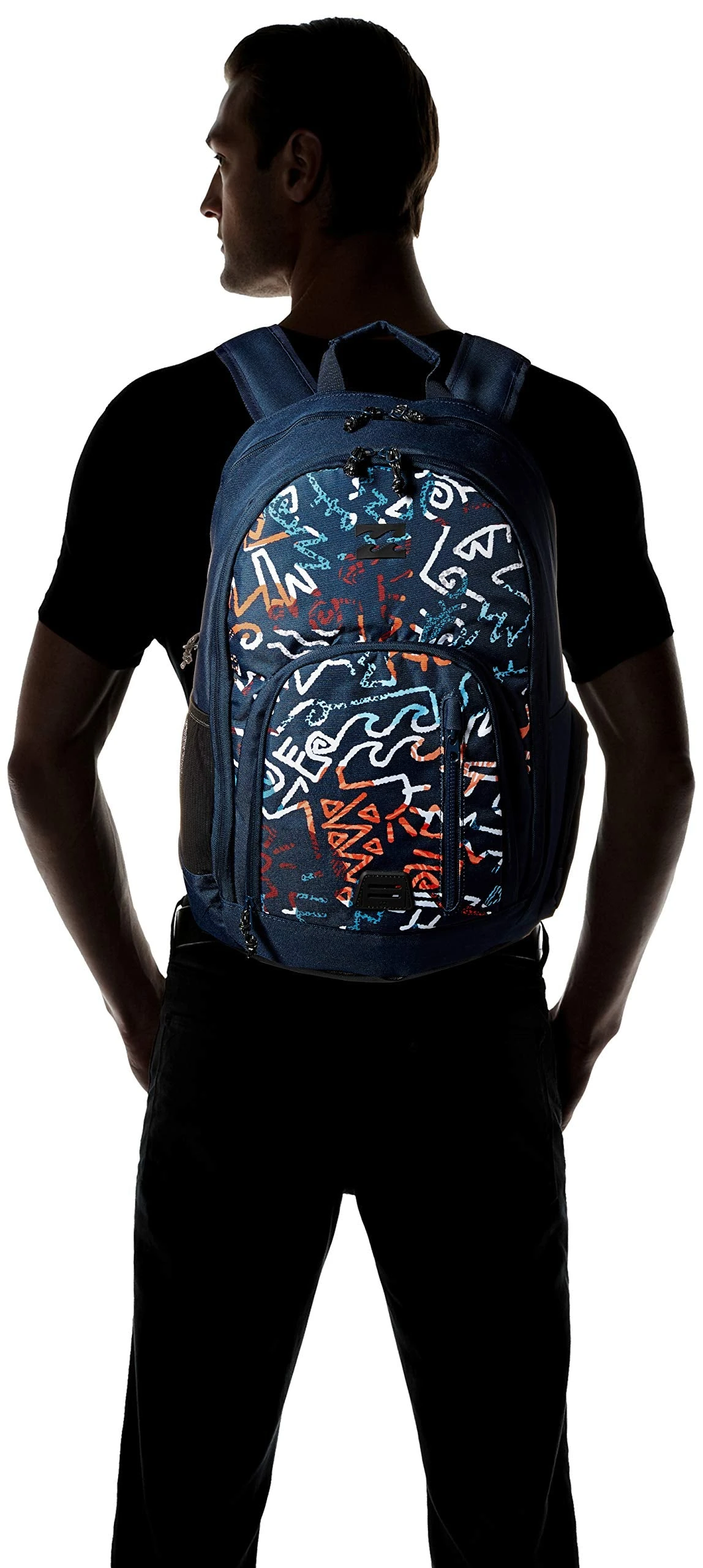 - Mens backpack., Large main compartment., Padded laptop compartment., iPad pocket., Durable suregrip base., Padded back panel., Helmet loop., Side mesh water bottle pocket., Size: 21 inches high x 13.5 inches wide x 10 inches deep / 32 liter volume.