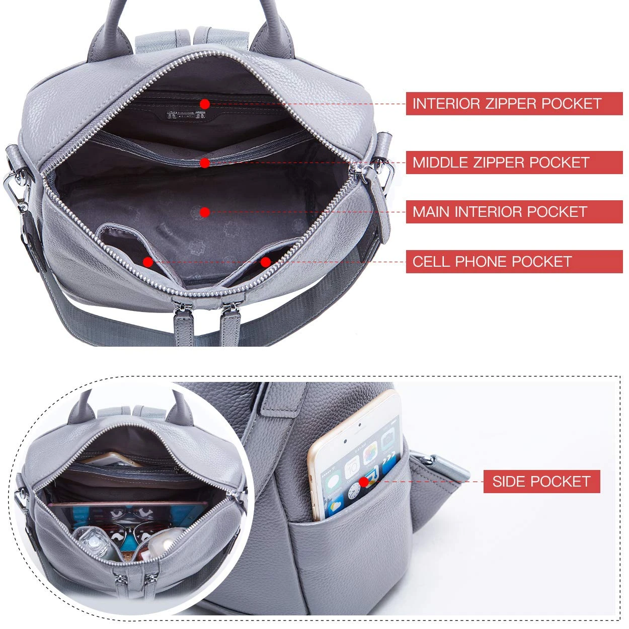 - Top handle,Zipper closure with long shoulder handle. Shoulder bag with buckle fastening adjustable shoulder strap and can be changed to be used as:Backpack,Messenger bag,Shoulder Bag,Handbag,Sling Bag or a Hobo.The straps are very comfortable and sturdy,can be last long time.
