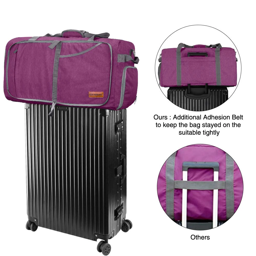 - GOTTA LOVE BONUSES: 1.) Side shoe pocket has two exclusive ventilated air vents and can also be used as a dirty laundry compartment, water & odor resistant. 2.) The sleeve on the back of the duffle has an additional adhesion belt to keep the bag stayed on the suitcase tightly. 3.) It comes with rounded stitched grip handles and padded, adjustable, removable shoulder strap buckle