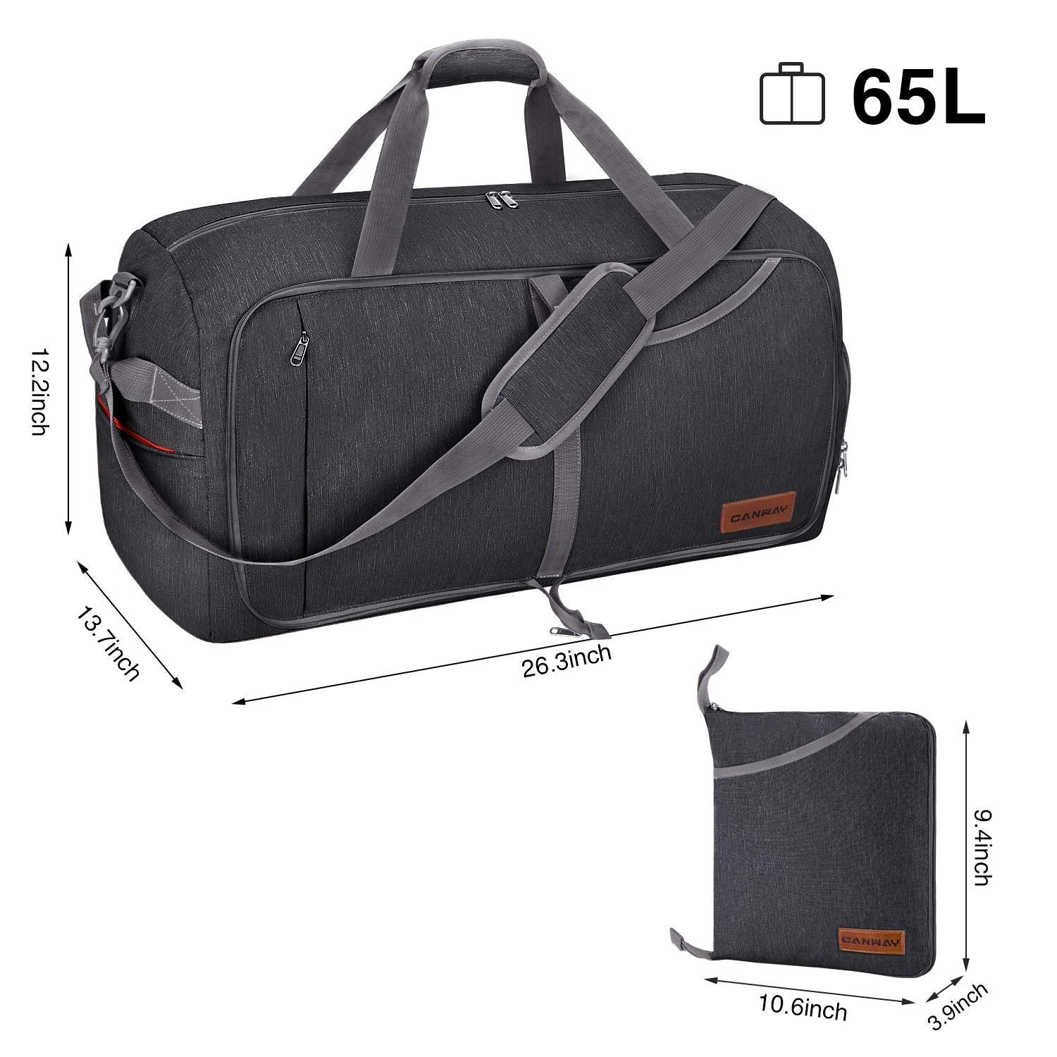 - LARGE FOLDABLE DUFFLE: It extends to 26.3 x 13.7 x 12.2 inch with 65 Liters capacity and 1.74 pound. Folded Size:10.6 x 9.4 x 3.9 inch, easy to store. This duffle bag has one spacious main compartment and 6 separate pockets.Keep your belongings well organized.