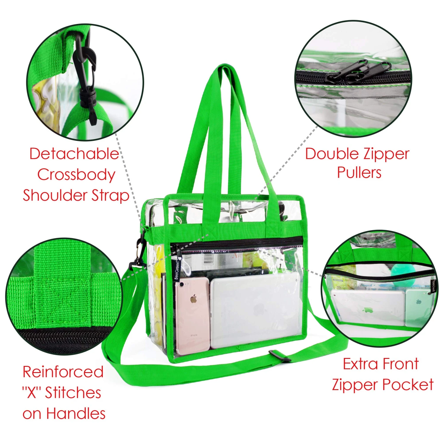 - QUALITY MADE – Made of thick vinyl which feels strong and durable, but not so thick that it feels stiff and rigid. 3cm wide strong THICKER nylon handles are reinforced with X sewing so you can comfortably carry a heavy load and Lime strap is suitable clear messenger bag for women.All seams are reinforced with double stitches which makes clear purse avoid tearing and hold heavy loads safely. Top sturdy zipper closure with Double zipper pulls keeps all your belongings dry and safe!
