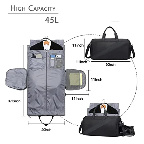 - Multifunctional Structure:Capacity: 45L. With multiple zipper pockets, it maximizes storage capacity, holding everything from suits, dresses, shoes, ties, and other belongings. This garment travel bag has been designed to keep everything you need well-organized on the go.