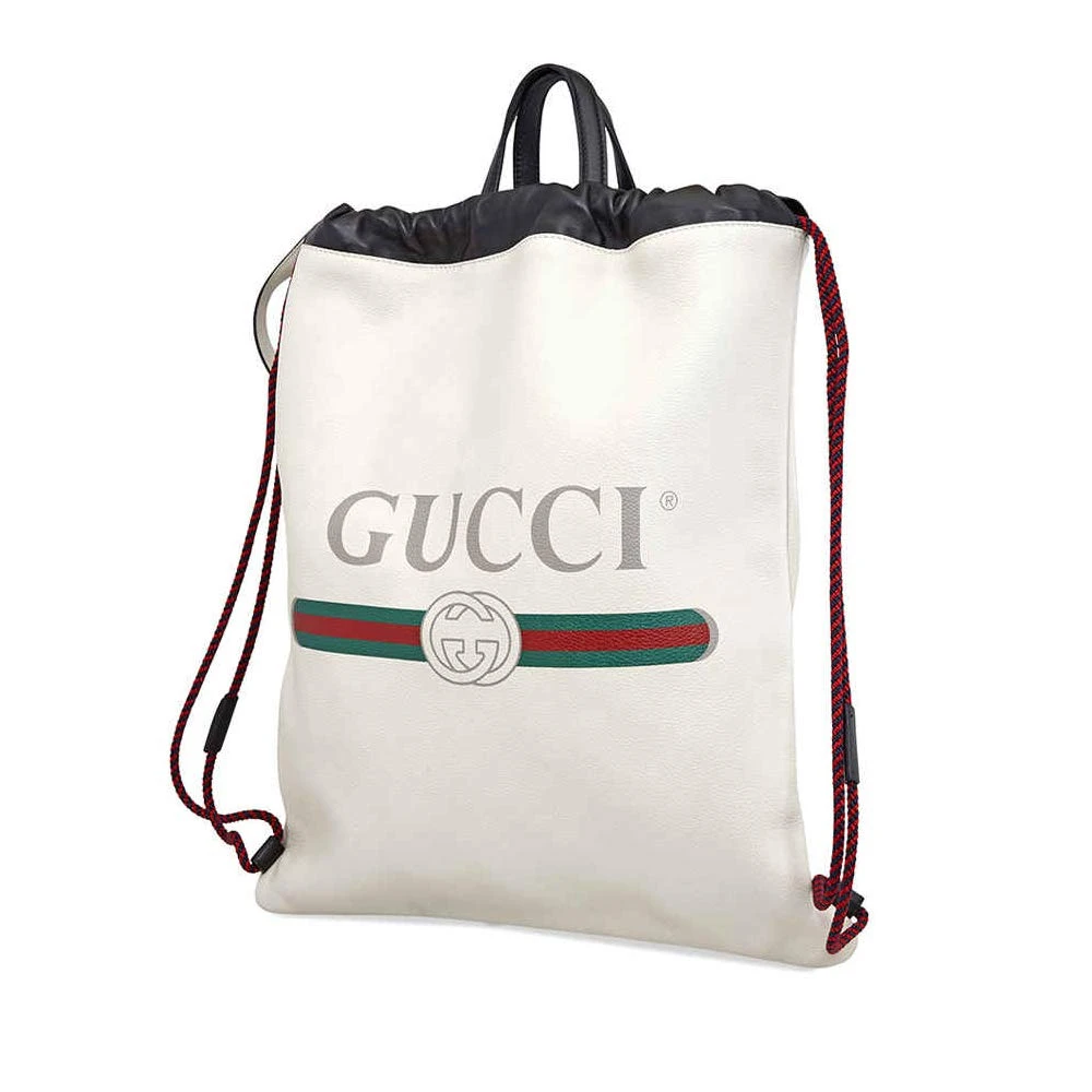 Details: Gucci Printed logo backpack. SKU:516639 0GCBT 8821 Color: White. Cream drawstring backpack from Gucci. Made of textured leather. Printed green, red and green signature ‘Web’ strap and brown and grey logo at front. 2 semi-round handles. Adjustable shoulder cords. Cream suede inner layer. 1 compartment with zip sachet inside. Outer Layer: Leather Inner Layer: Suede Other Elements: Metal