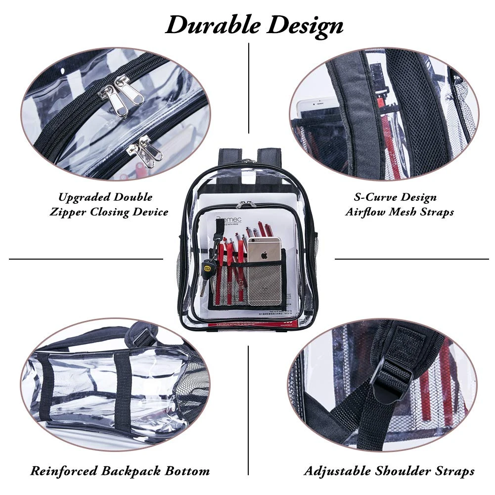 - [ Heavy Duty Clear Backpack ] Made of ultra-thick,comply with CP65, no harmful chemicals transparent PVC waterproof material, upgraded double zipper closing device and reinforced bottom, collection of stylish and security design in a transparent backpack,is the perfect choice forwork, security travel and sporting events!