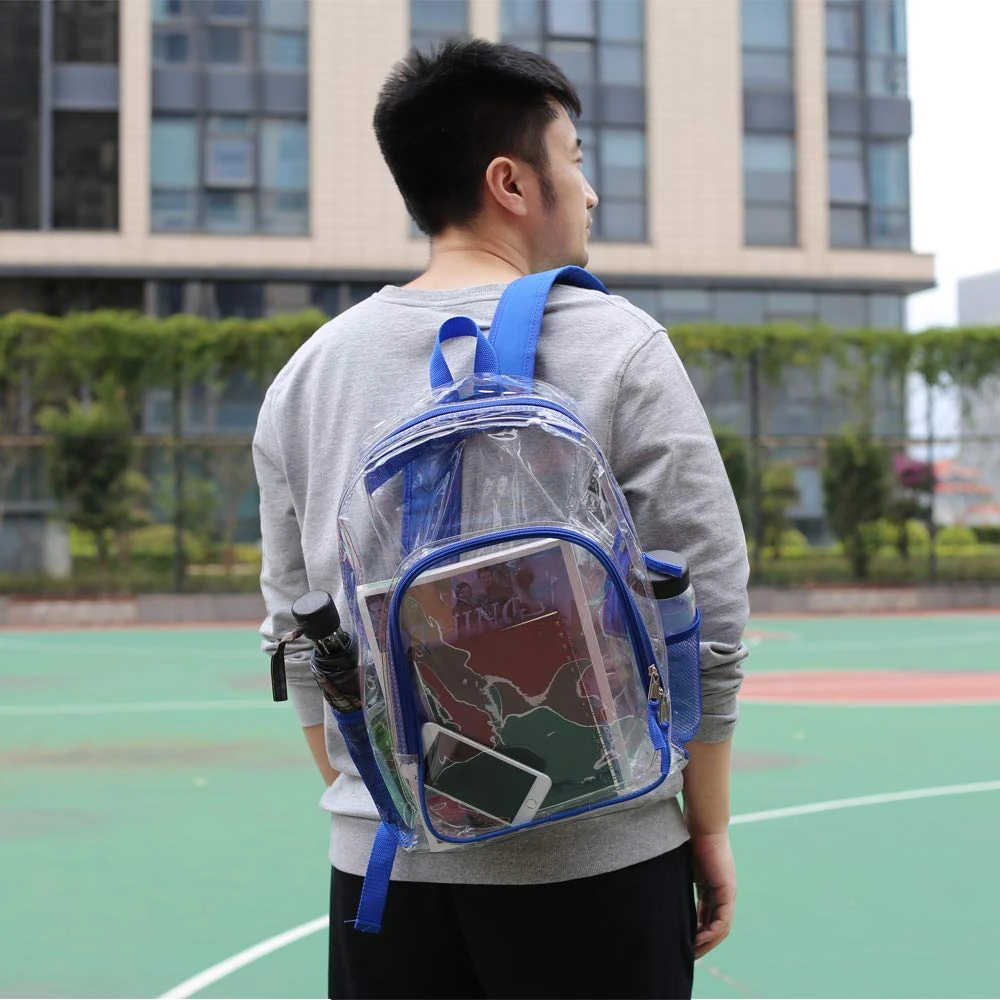 The transparent backpack has enough space for books, notebooks, folders, personal items, and an