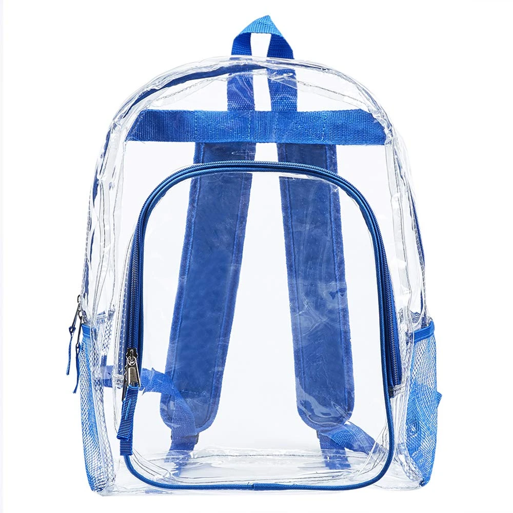- [ Heavy Duty Clear Backpack ] Made of heavy duty comply with cold-resistant CP65, no harmful chemicals Clear PVC waterproof material, Main dual Zipper closure Transparent Backpack with Completely see through all around, including back and bottom. Which is perfect for travel, security, stadium sports and much more!