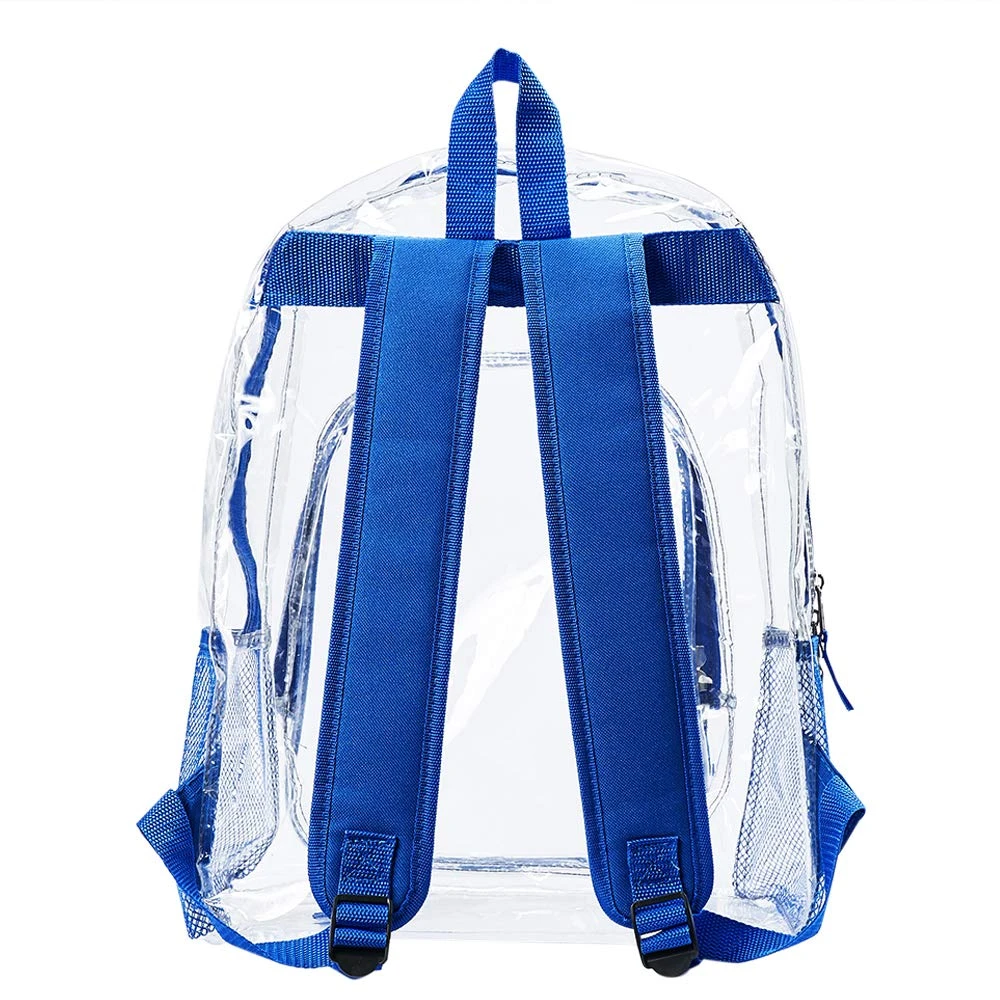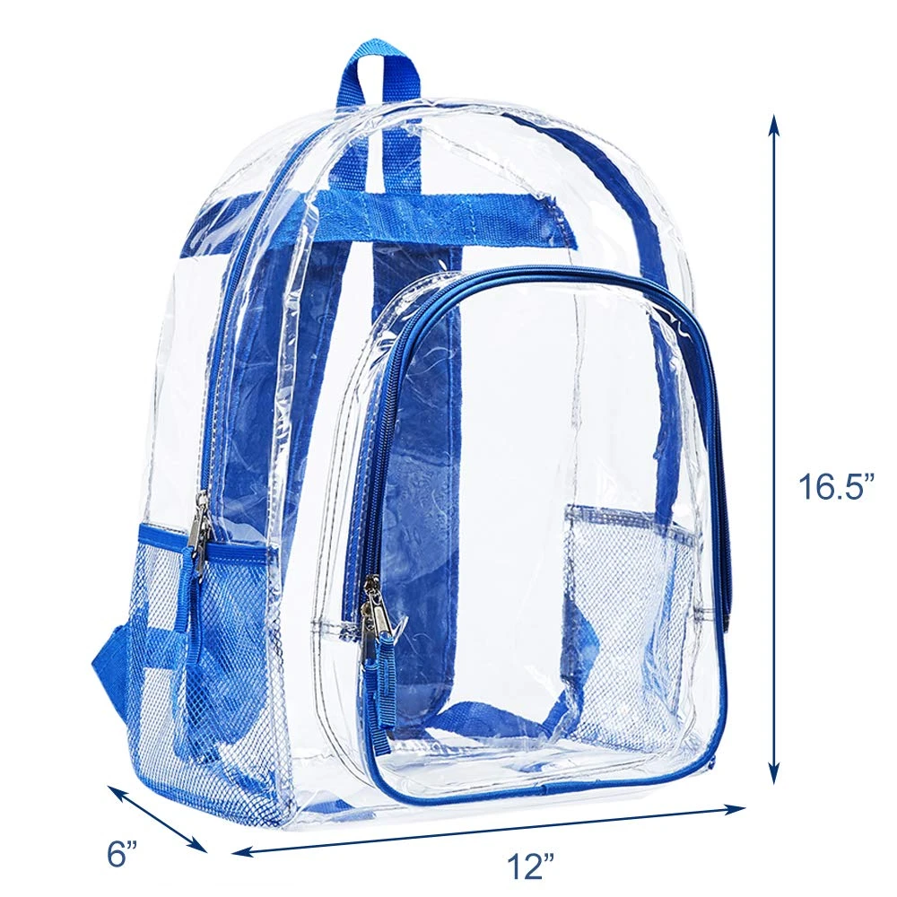 - [ Large Capacity ] Compartment measuring 16.5″Hx12″Lx6″W with ample storage space to accommodate books, binders or even a laptop. This see-through backpack also features an additional 12″Hx9.5″Lx1.5″W front accessory pocket, complete with adjustable shoulder straps and 2 mesh pockets for bottles.