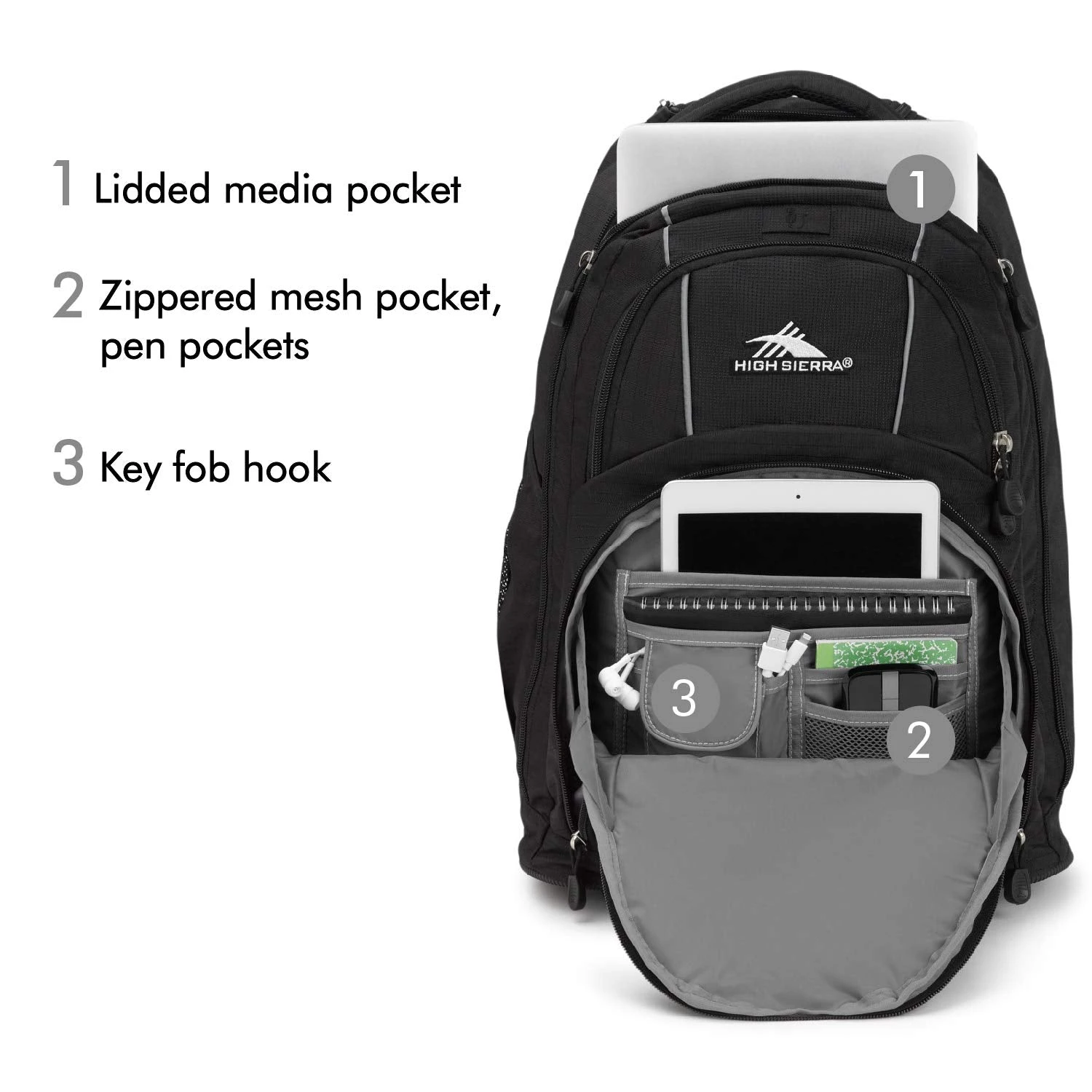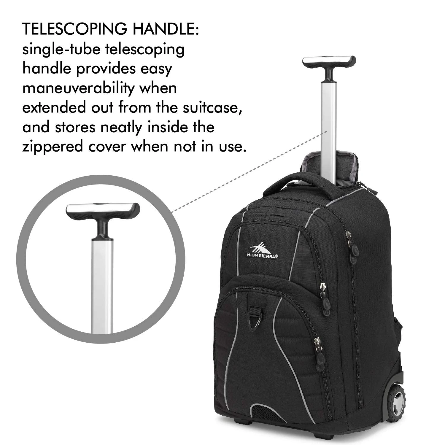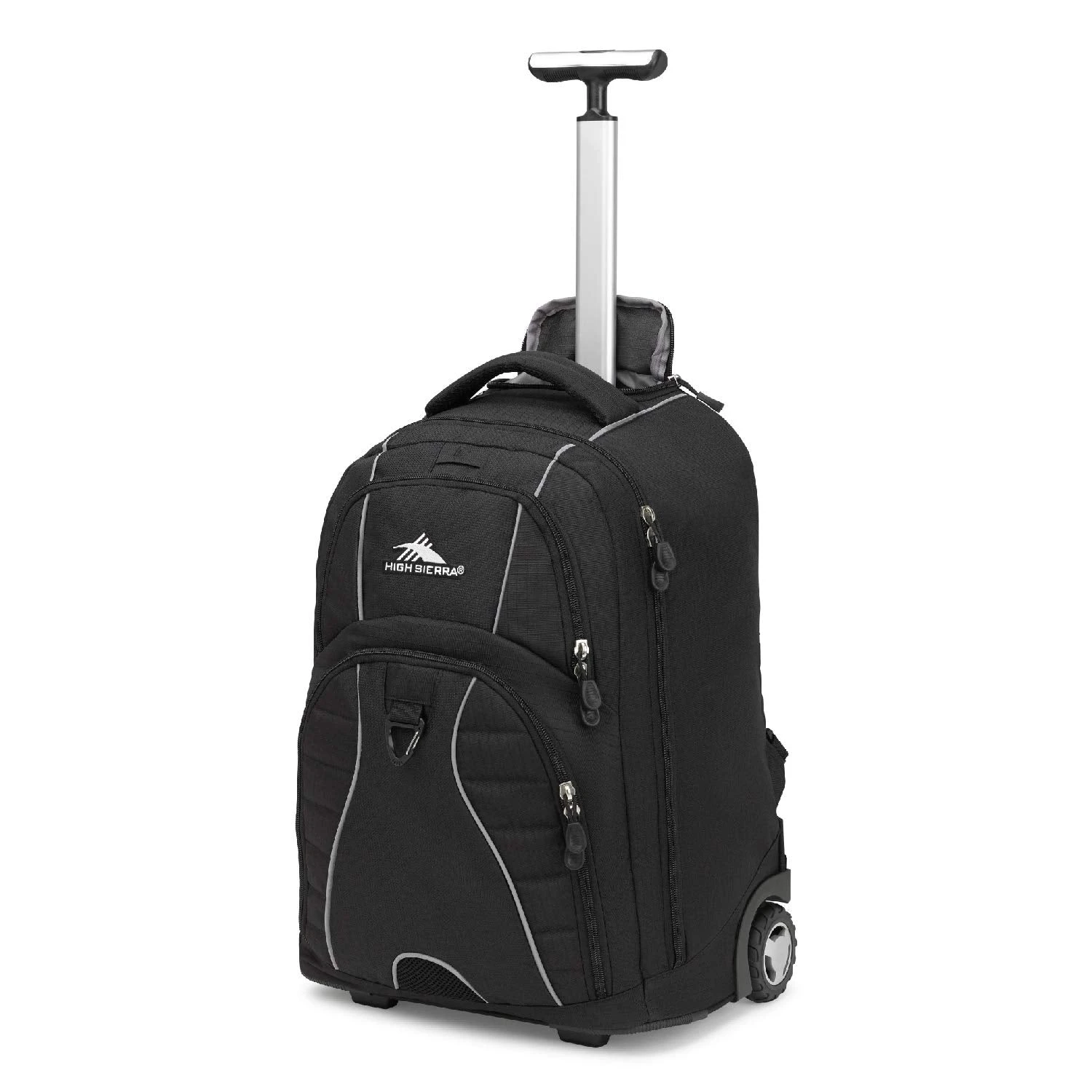The High Sierra Freewheel book bag makes traveling with a full load a breeze. Designed with two inline-style wheels and a telescoping handle, it allows you to cruise smoothly from place to place, and a Cushion Zone padded computer sleeve holds most laptops up to 17 inches.