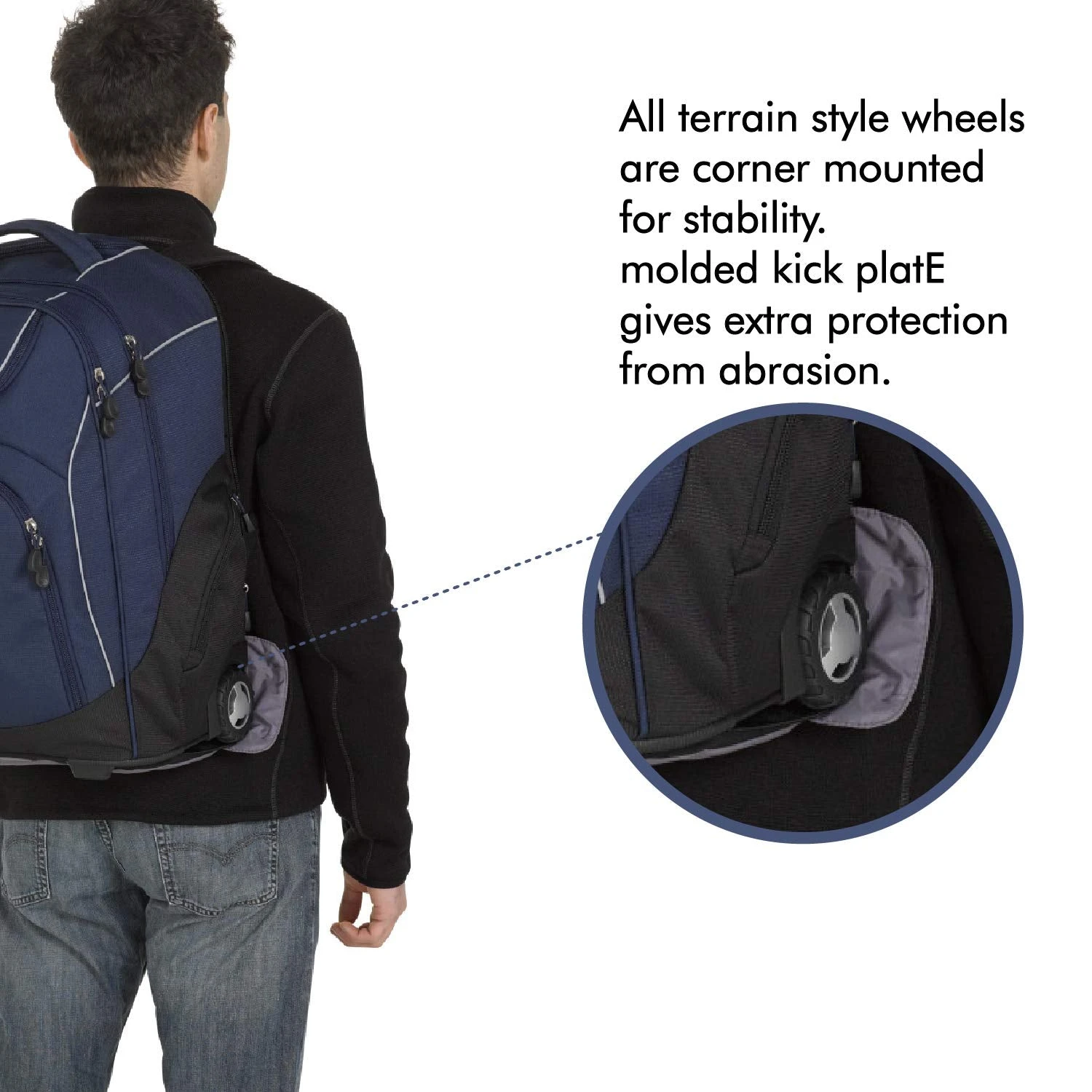 - LAPTOP COMPARTMENT, MEDIA POCKET: this wheeled laptop backpack comes with a fully padded CushionZone laptop compartment that fits most 17-inch models; a media pocket with headphone port allows you to enjoy your favorite music or audiobook anywhere you go