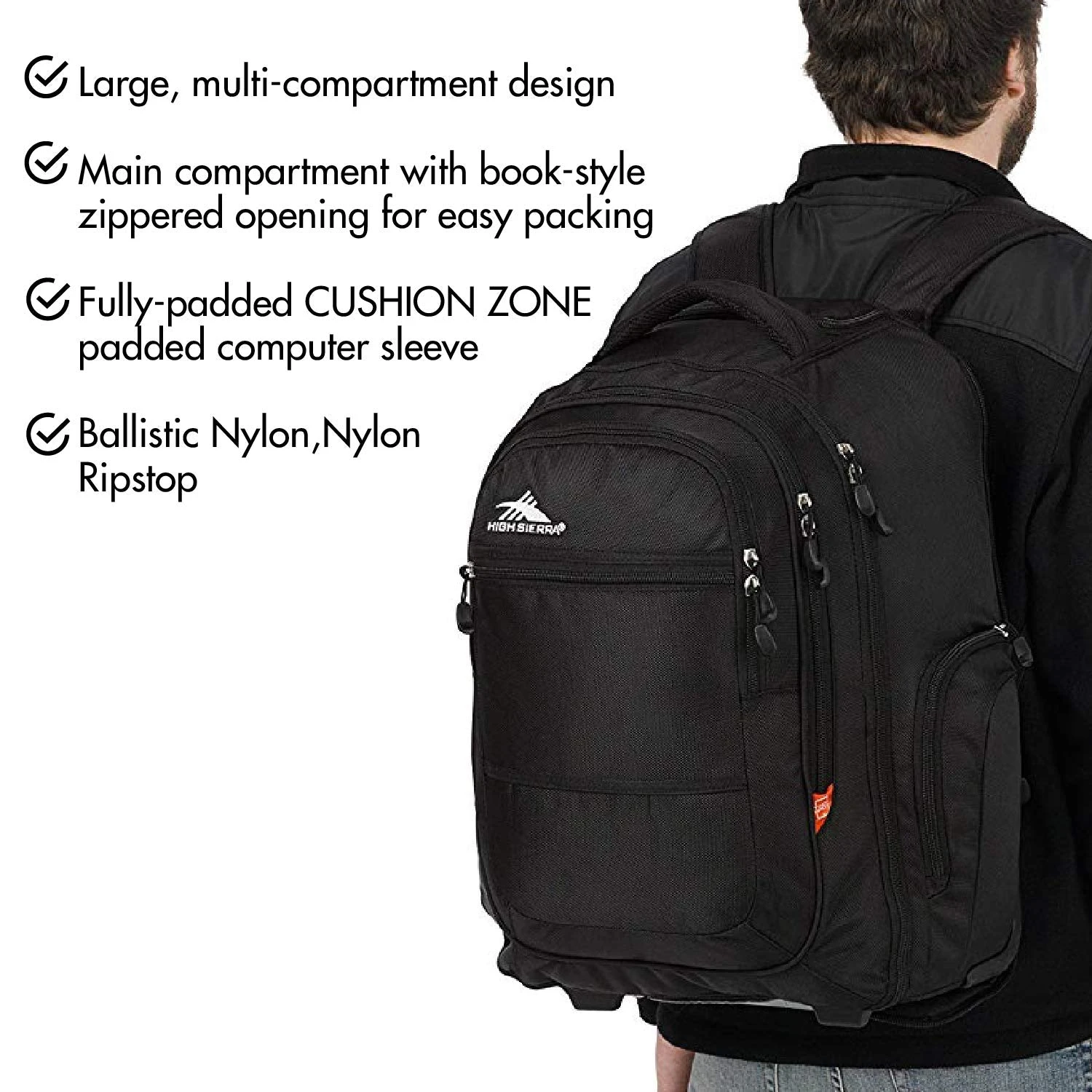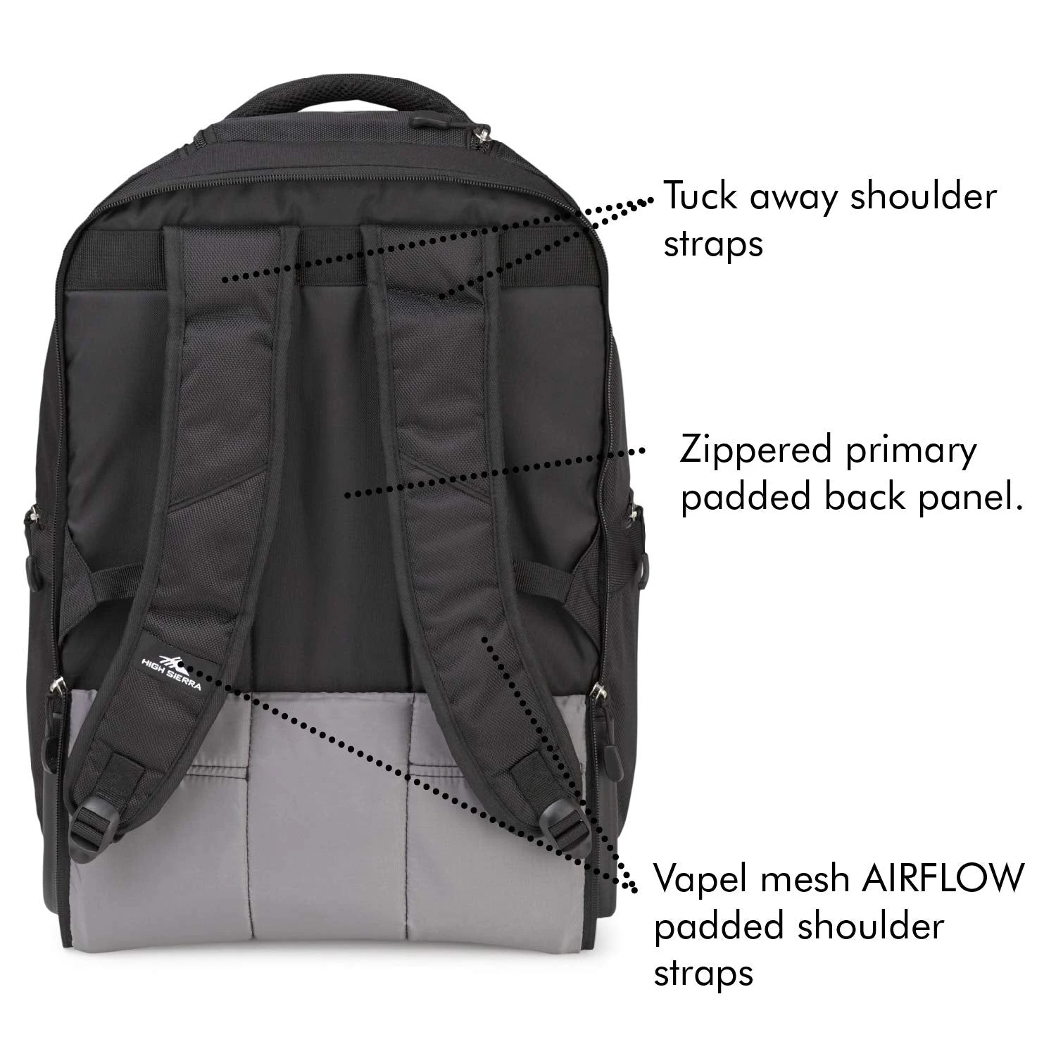 Travel in stress-free comfort with the High Sierra Rev Wheeled Laptop Backpack. Perfect for college students and office workers alike, this wheeled laptop backpack is the go-to travel companion, with features such as: