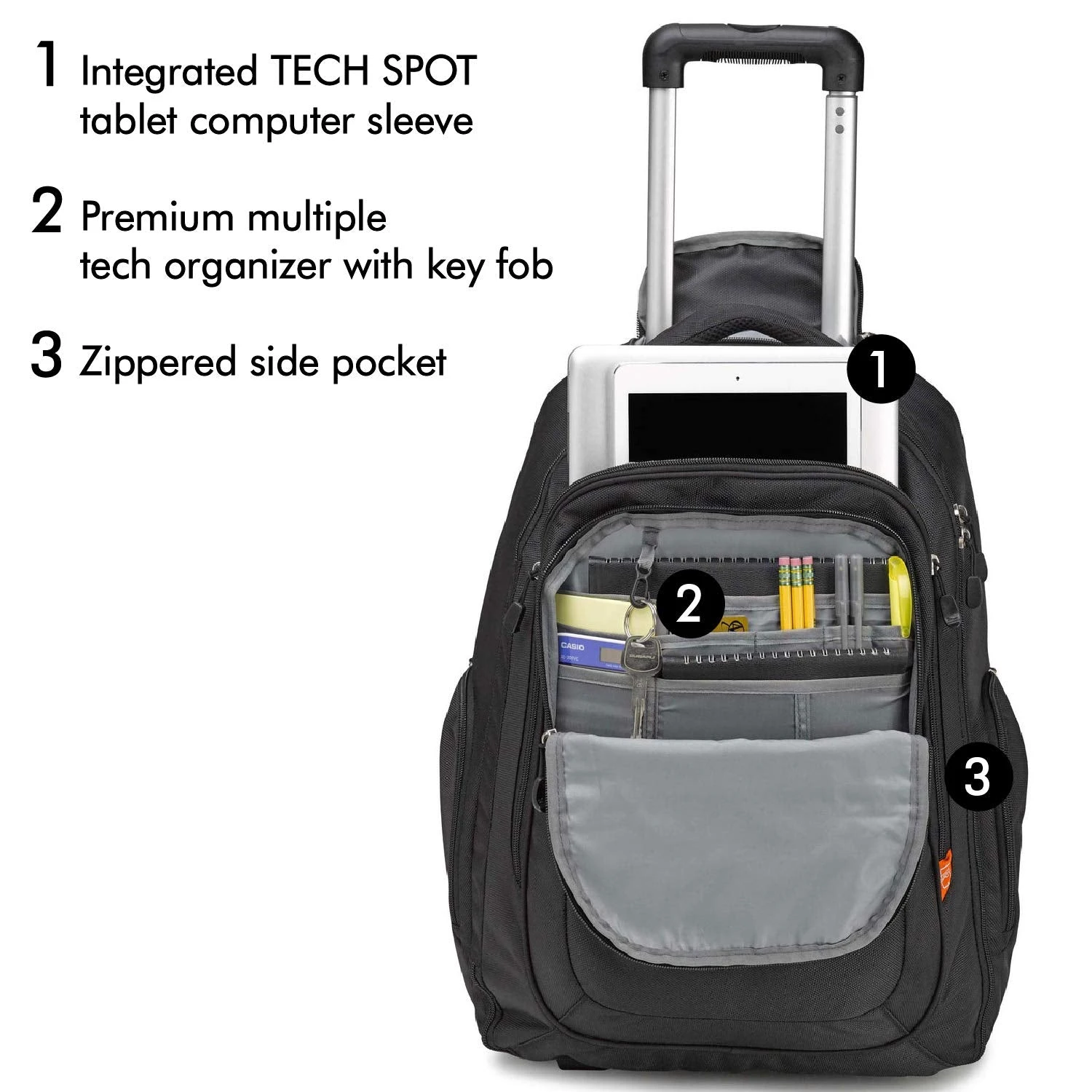 Keep your items organized with the laptop wheeled backpack’s built-in interior organizer, featuring a phone pocket, a compartment for books or notebooks, and other small pockets to store all of your personal accessories. It also comes with a key fob for easy access to your car, home, or dorm keys. This laptop backpack for college students also boasts a large, book-style zippered main compartment for easy packing.