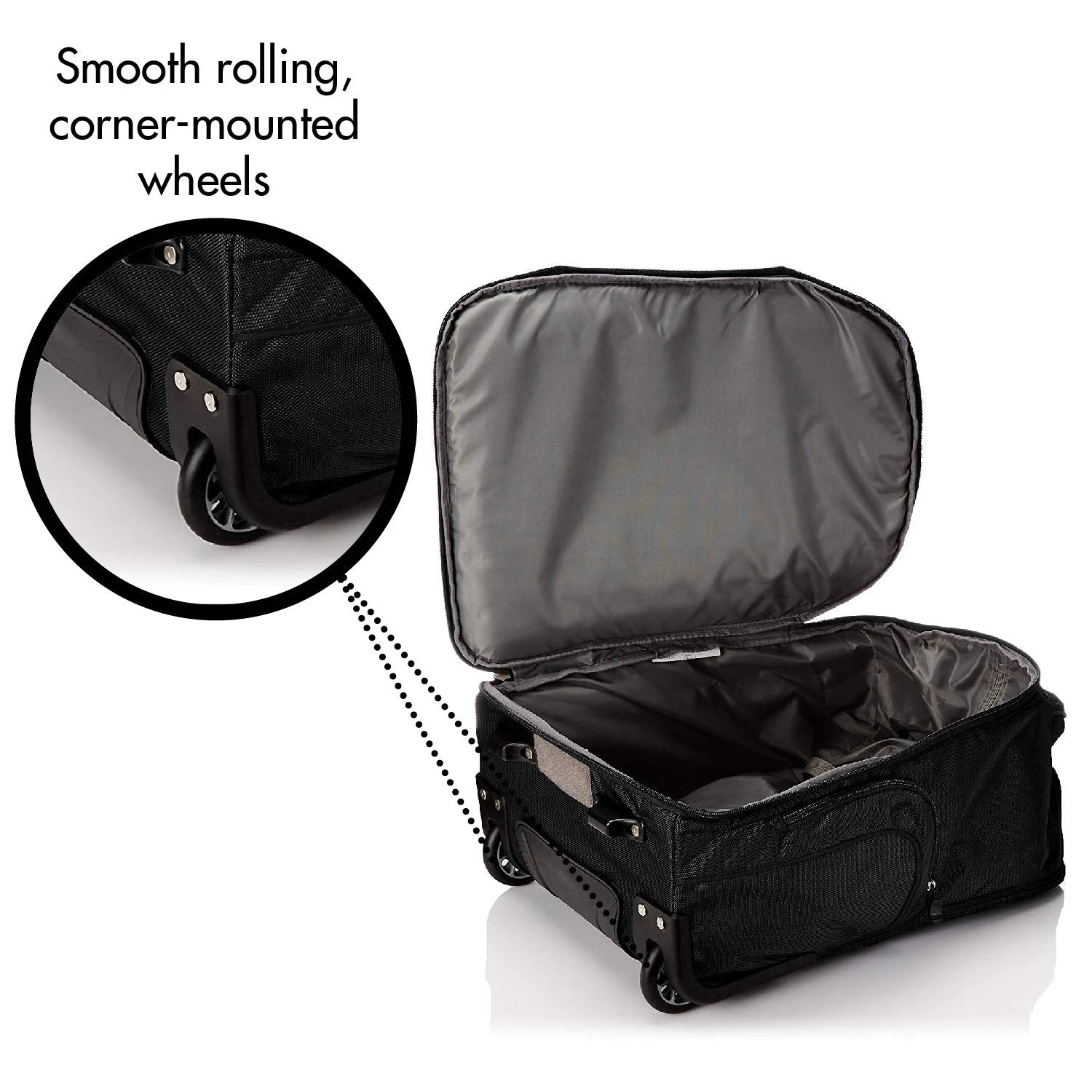 It’s smooth rolling, corner-mounted wheels make it easy to drag along most surfaces; and it’s retractable handle locks in place when fully-extended or stored. When the terrain gets rough, use the hidden backpack straps for an additional carry option, making it the ideal travel companion.