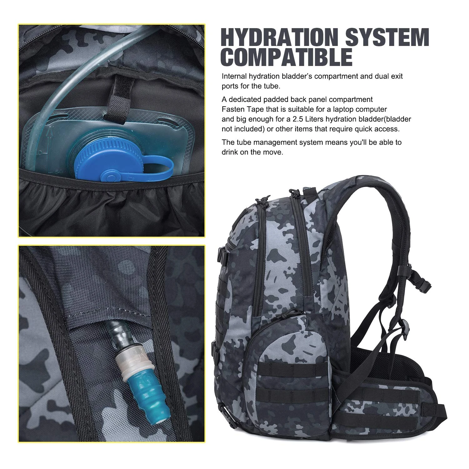 - HYDRATION COMPARTMENT- This assault pack with hydration compartment and can hold a 2.5 Liter bladder, the tube is fed through the top of the bag near grab handle.