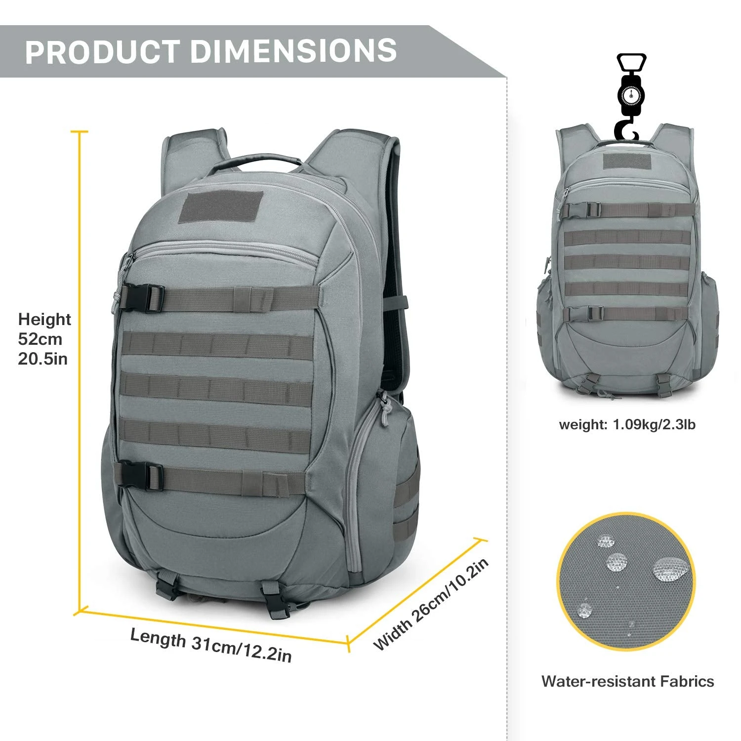 - MATERIAL- 35 Liters. This military backpack is made of 600D polyester. YKK Zipper.
