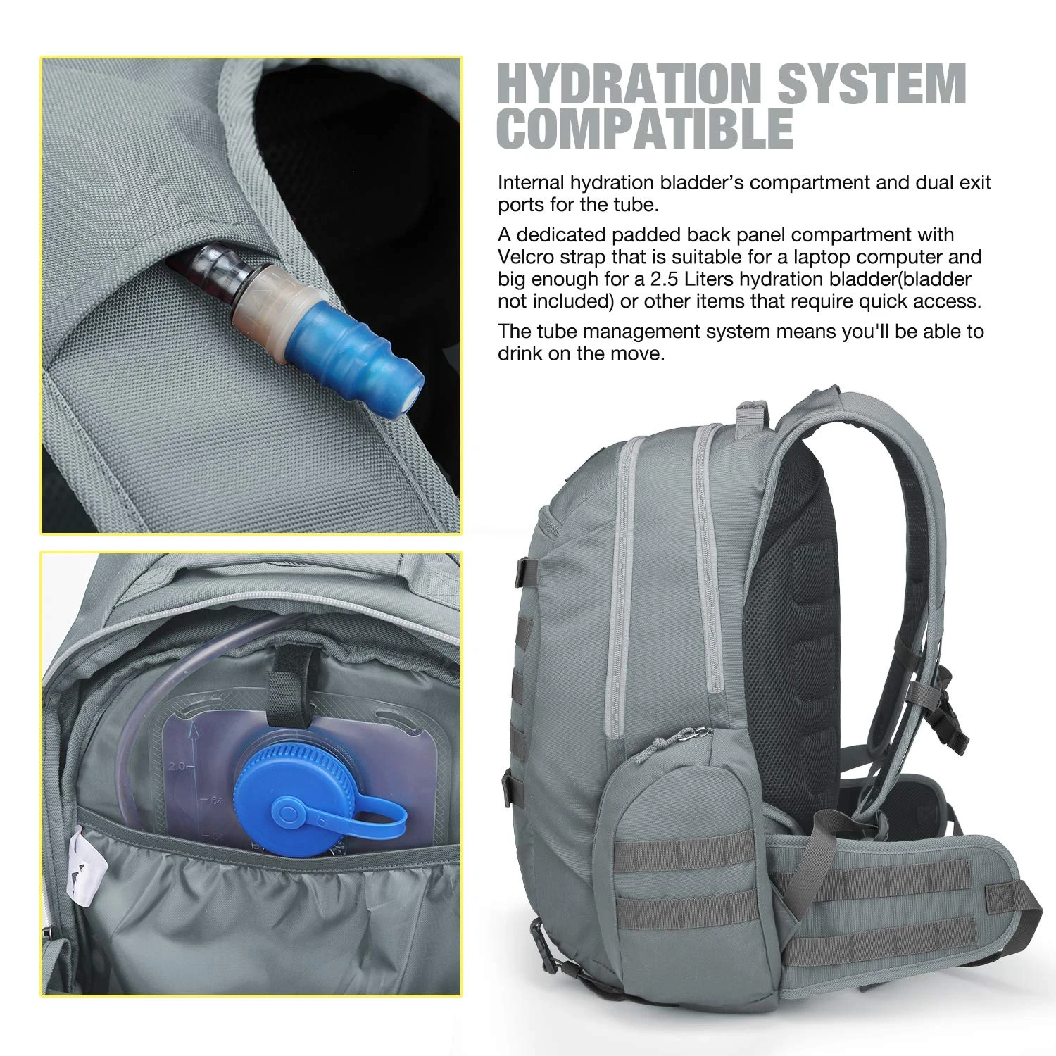 - HYDRATION COMPARTMENT- This assault pack with hydration compartment and can hold a 2.5 Liter bladder, the tube is fed through the top of the bag near grab handle.