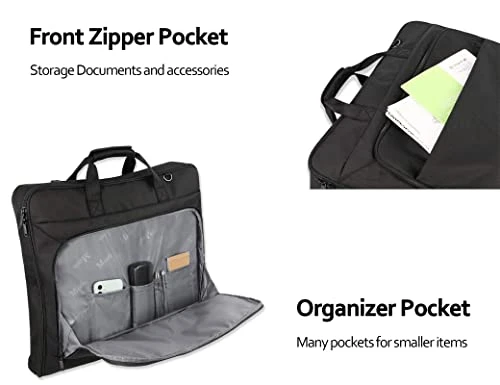 - AMPLE SPACE & PLENTY OF POCKETS: Travel garment bag with the main compartment for hanging clothes,carrying a suit, uniform, coats, dresses; As suit bags for men travel, 2 internal zip pockets with large capacity for carrying shirts, ties, personal toiletries; The pocket with hook and loop is perfect for shoes; Extra external pockets for carrying business documents, magazine, pens, cards. The large garment bag keeps organized.