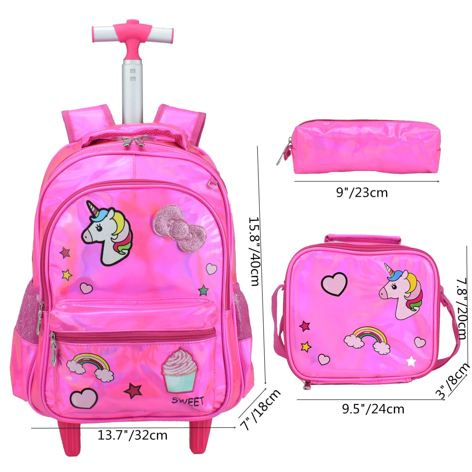 Let us go out to play Kids love to play whenever it is possible , we design our luggage backpack to be playful! The bag can pretty much stand by itself , so free your hand when you play and free children from the painful weight.Just storage what you want , Bottle ,umbrella ,or even snacks . very easy to Store or take . 3 Piece-you can get:a Rolling backpack and a pencil case and a lunch bag.According to your kids needs,he can use them to put different things.Luggage ,Backpack, Handbag in one.Note: Hand wash only ,No machine-wash. Please kindly allow little color difference due to different camera or light environment ,thanks! Since size is measured by hand,please kindly allow some measurement error,thanks!