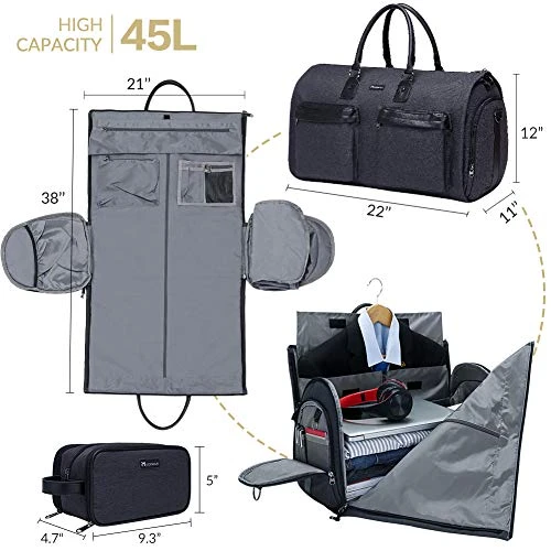 - 45L DUFFEL BAG with ORGANIZER POCKETS; After assembled, this garment duffel bag work perfect as a 45L duffel bag/travel weekender bag. At the left side pocket of this garment bag is a shoes pouch. And the right side pocket is designed for passport, keys and some other small items. Garment Bag with Two front pockets for small pieces. Convenient pockets for Quick access.