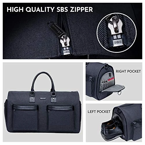 - WATER-RESISTANT DUFFEL BAG; Using Sturdy SBS ZIPPER & High quality Polyester Fiber & Jacquard with Vegan Leather accents, And this garment bag is scratch-resistant, anti-tear & anti water splashing. Included a Detachable Shoulder Strap, so it can be shoulder bag if needed. The detachable shoulder strap is adjustable to make this garment bag fits your shoulder well.