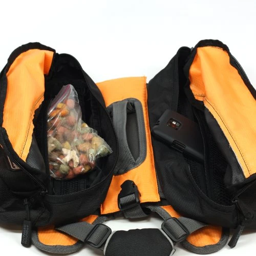 Large pockets feature wide openings and zipper closures to carry food and water
