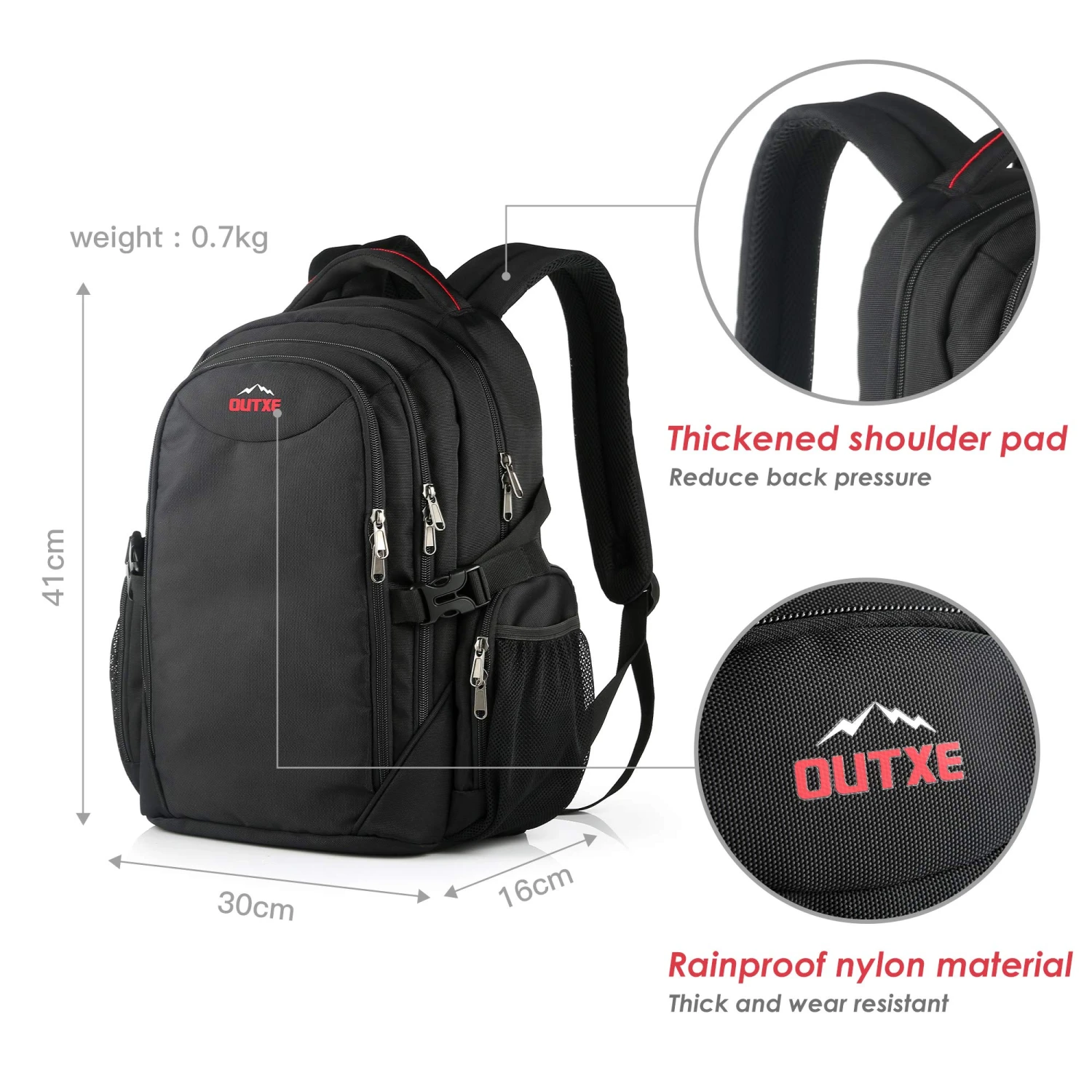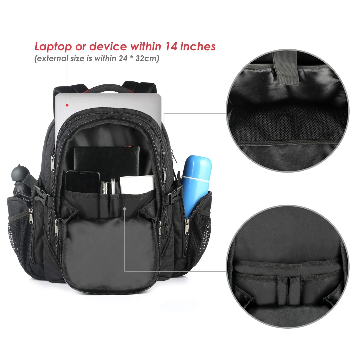 - Multiple Pockets: One large zippered front pocket big enough for a 14″ laptop; two side pockets for a water bottle or umbrella; and one small zippered front pocket for small items. Interior dimensions (30x16x41cm)