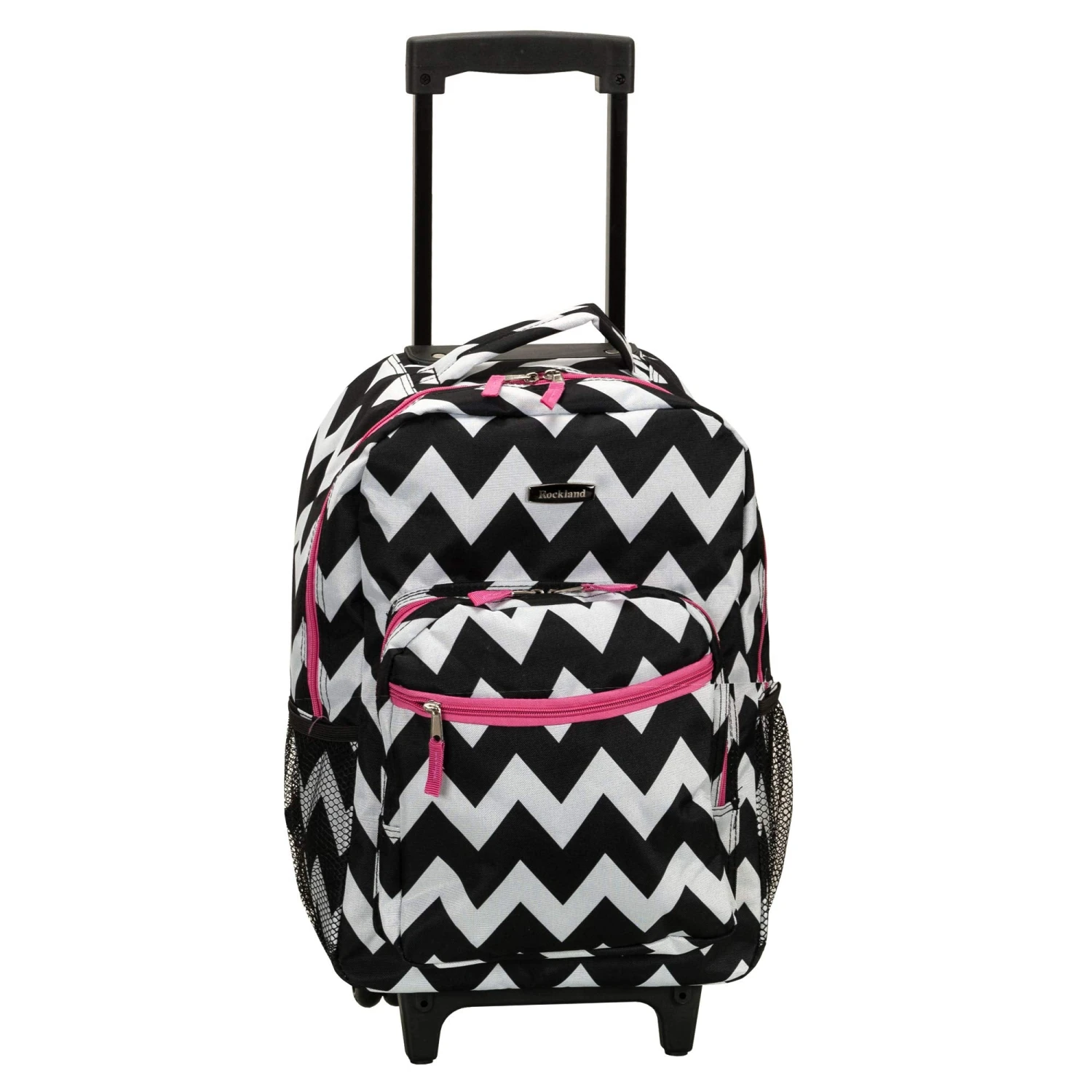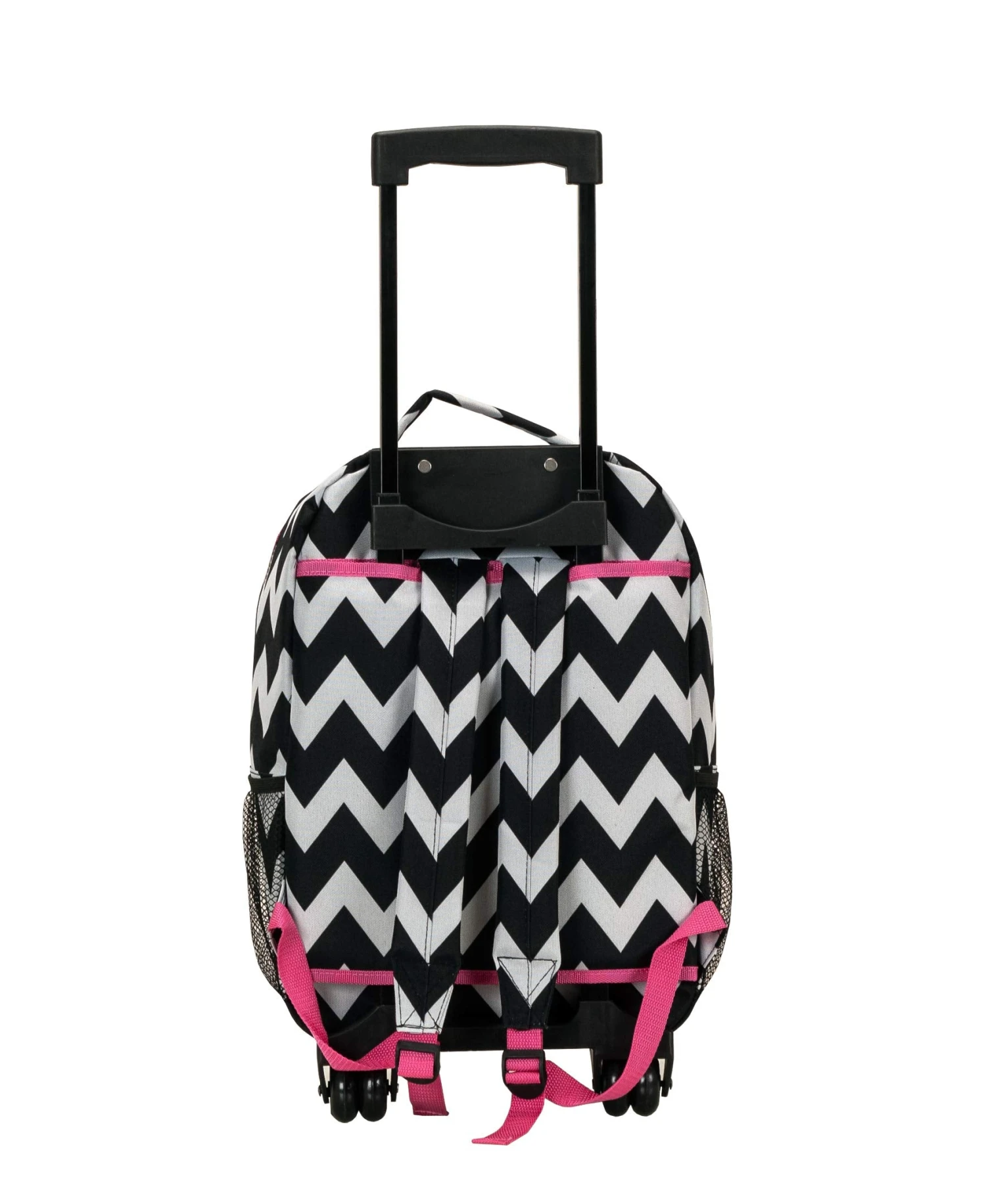 Details: Rolling backpack with double skate wheels. Measures 13 inch lx10 inch wx17 inch h. Features include 2 zippered pockets on the front of the bag with one having a built in organizer. Zippered main compartment opens to large storage opening, and two mesh side pockets. Fabric handle at the top and telescoping pull handle. Bag made of durable polyester with metal telescoping handle and heavy duty plastic stand on bottom to keep the bag standing.