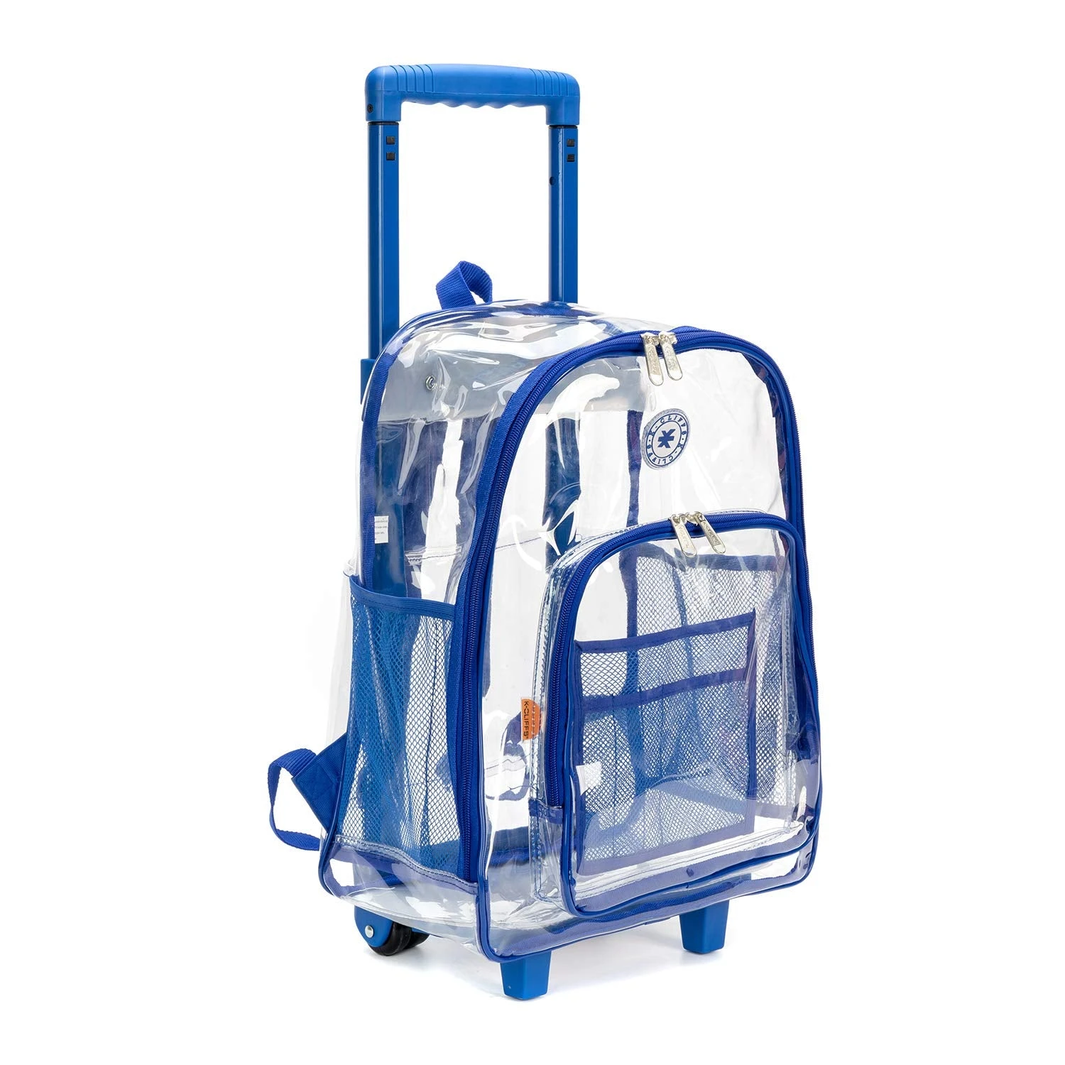 Details: This is the rolling backpack version of one of our best selling clear backpacks! Lightweight yet durable, this clear school backpack is perfect for schools who require see through backpacks as well as showing off your goods. Measuring 17 by 7 by 13.5 inches, the simple interior provides plenty of space for school books, notepads, folders, personal items, and more, while its completely transparent design makes it easy to see what’s inside. If things get too heavy for the shoulders, tuck the straps in and pull out the 38-inch 3-section handle and roll in style. Specifications Material: 0.5mm Thick PVC PlasticBackpack Dimension: 17″x13.5″x7″ Handle Height: 38″ CAUTION: When utilizing the rolling feature on the backpack, ensure that shoulder straps are stored inside the flap to avoid damage to straps while rolling.*Tuck Shoulder straps into back padded panel to avoid damage to straps. Note: The manufacturer warranty on this product lasts 30 days from your date of purchase. Manufacturer warranties cover only manufacturer defects and zipper mechanism damages from normal intended usage.