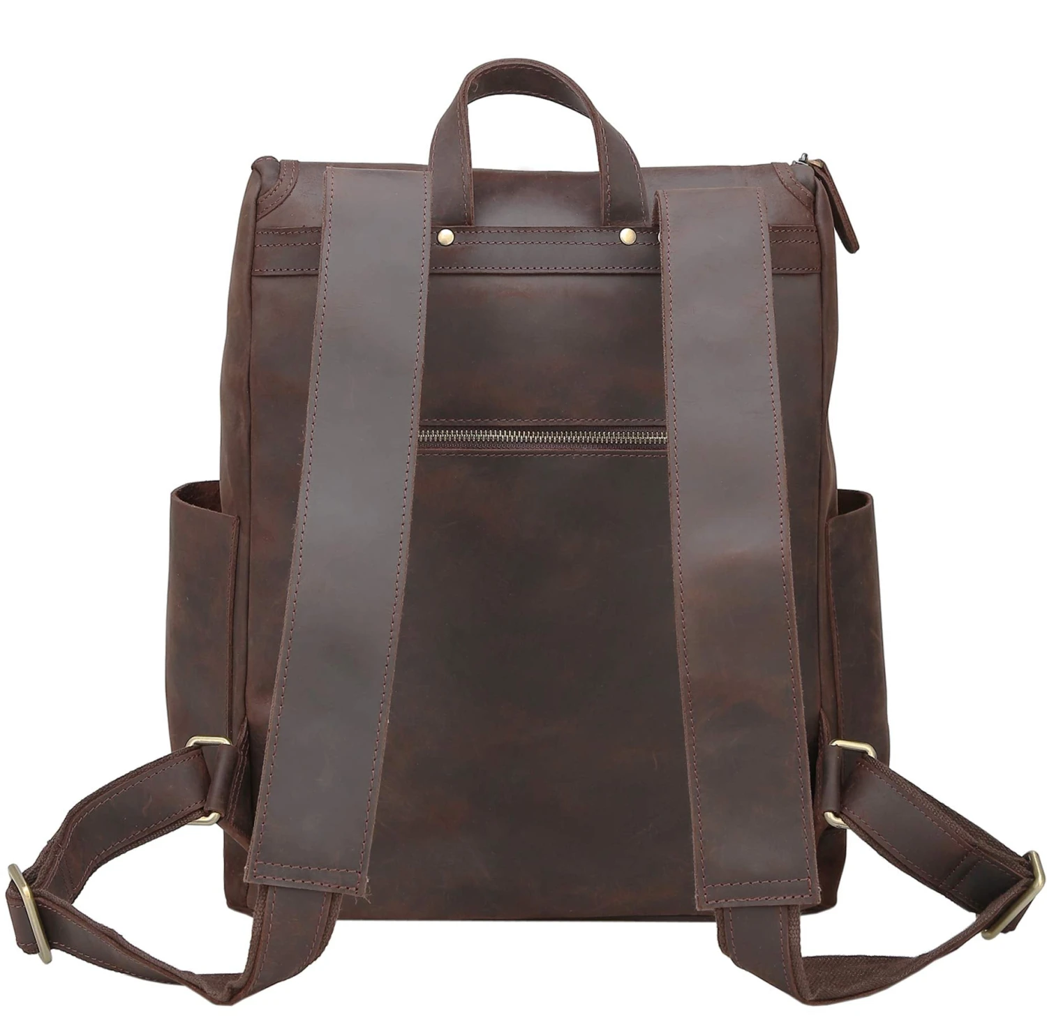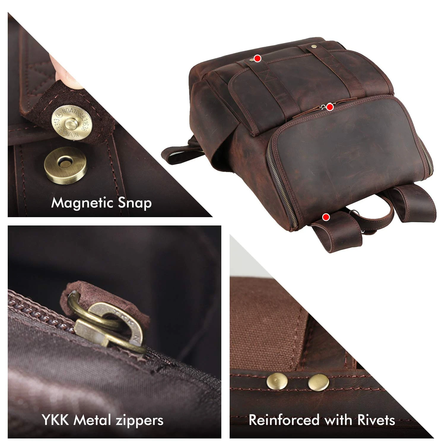 - Latest Improvement: Upgraded backpack has YKK zippers and soft cotton lining, we also have reinforced our shoulder strap with rivets at the back of our backpack. To make sure our backpack fits most of our customers needs. This leather backpack is crafted of Full Grain thick cowhide leather, hand-made by professional. Invest in our bags, you will have a pleasant and worry-free journey.