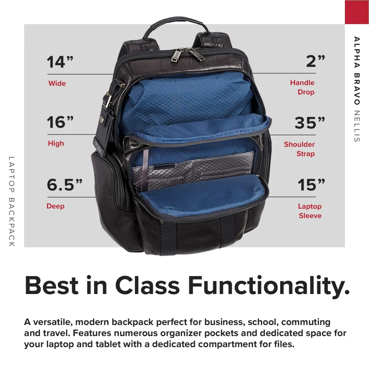 - BEST IN CLASS FUNCTIONALITY: A versatile, modern backpack perfect for business, school, commuting and travel. Features numerous organizer pockets, a dedicated padded 15” laptop compartment, a padded tablet pocket, and a dedicated compartment for files. Additional features for this backpack include 2 side zip pockets (one with water-resistant lining), a quick access back pocket with a hidden magnetic snap, and webbing top carry handles with leather accent.