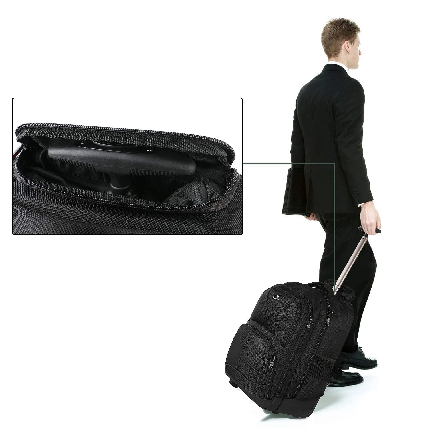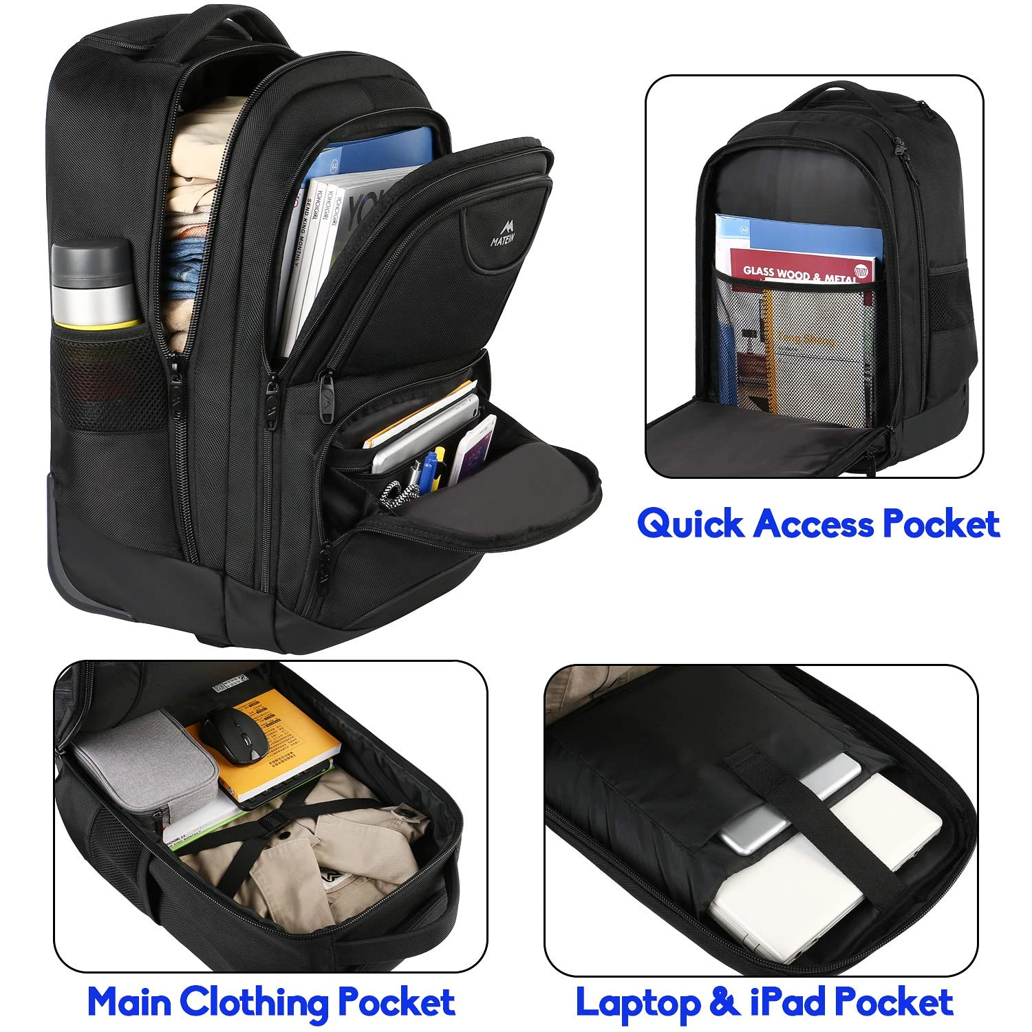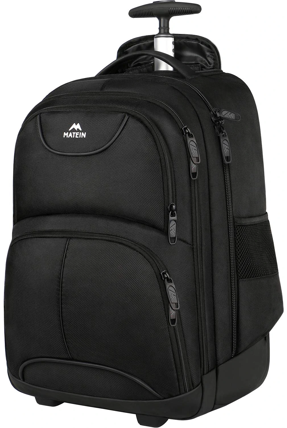 Details: Feature: A fully padded laptop compartment accommodates most 17-inch models Dual Mesh zippered side pockets for water bottles or umbrellas Zippered accessory loft pocket hide telescoping handle Back zippered compartment for stowing straps when not in use Back pockets with Velcro can carry small rags at any time, keep the back clean Main compartment zipper extends to bottom of the bag for easy packing Elasticized Belt fixes clothes or school books on main compartment, keep everything neatly Metal Hooks of Strap is designed to 360 degree rotation and very sturdy, easy to be adjusted Lockable Double Zippers with keyhole can lock the daypack with your anti-theft lock to protects your valuables inside from thief. As a good Thanksgiving gifts for son, daughter and husband Backpack Size: External Dimensions : 21. 65 x 13 x 10 in / 55 x 33 x 25. 4cm Laptop Pocket Dimensions: 16. 5 x 10. 75 x 1. 5 in Capacity: 2746. 07 cu in / 45L; Weight: 5. 3 pound At Matein, we provide the highest quality backpacks with the most reasonable value so every customer can find a backpack they love to carry. We create products that inspire people to live their lives passionately; exploring, creating, and living life in the moment.
