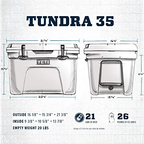 - The YETI Tundra 35 is portable enough for one person to haul while still having an impressive carrying capacity of up to 20 cans with a recommended 2:1 ice-to-contents ratio